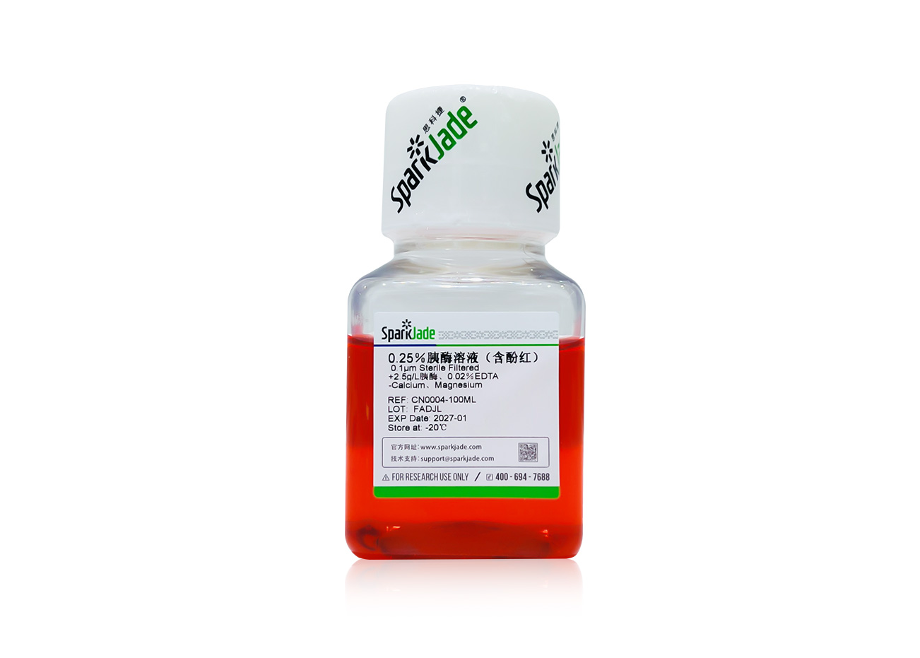 胰蛋白酶可以使细胞间的蛋白质水解从而使细胞离散。在PH为8.0,温度为37℃时,胰酶溶液的作用能力最强。本品含2.5 g/L胰酶(1:250)、0.02%EDTA,含酚红,不含钙、镁。 终止消化时,可用含有血清培养液或者胰酶抑制剂终止胰酶对细胞的作用。