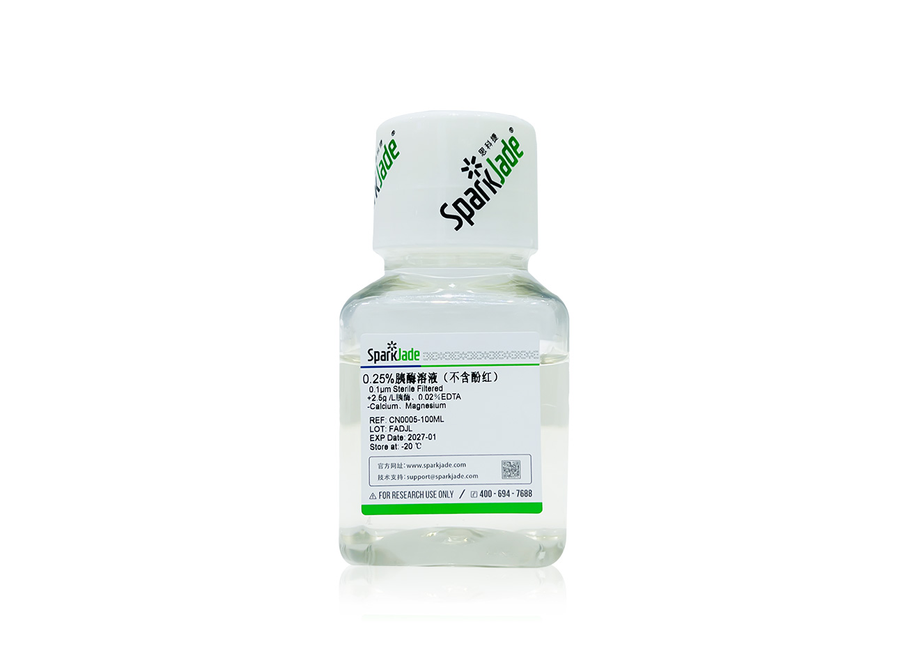 胰蛋白酶可以使细胞间的蛋白质水解从而使细胞离散。在PH为8.0,温度为37℃时,胰酶溶液的作用能力最强。本品含2.5 g/L胰酶(1:250)、0.02%EDTA,不含钙、镁、酚红。 终止消化时,可用含有血清培养液或者胰酶抑制剂终止胰酶对细胞的作用。